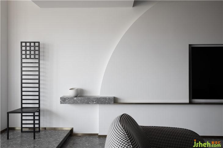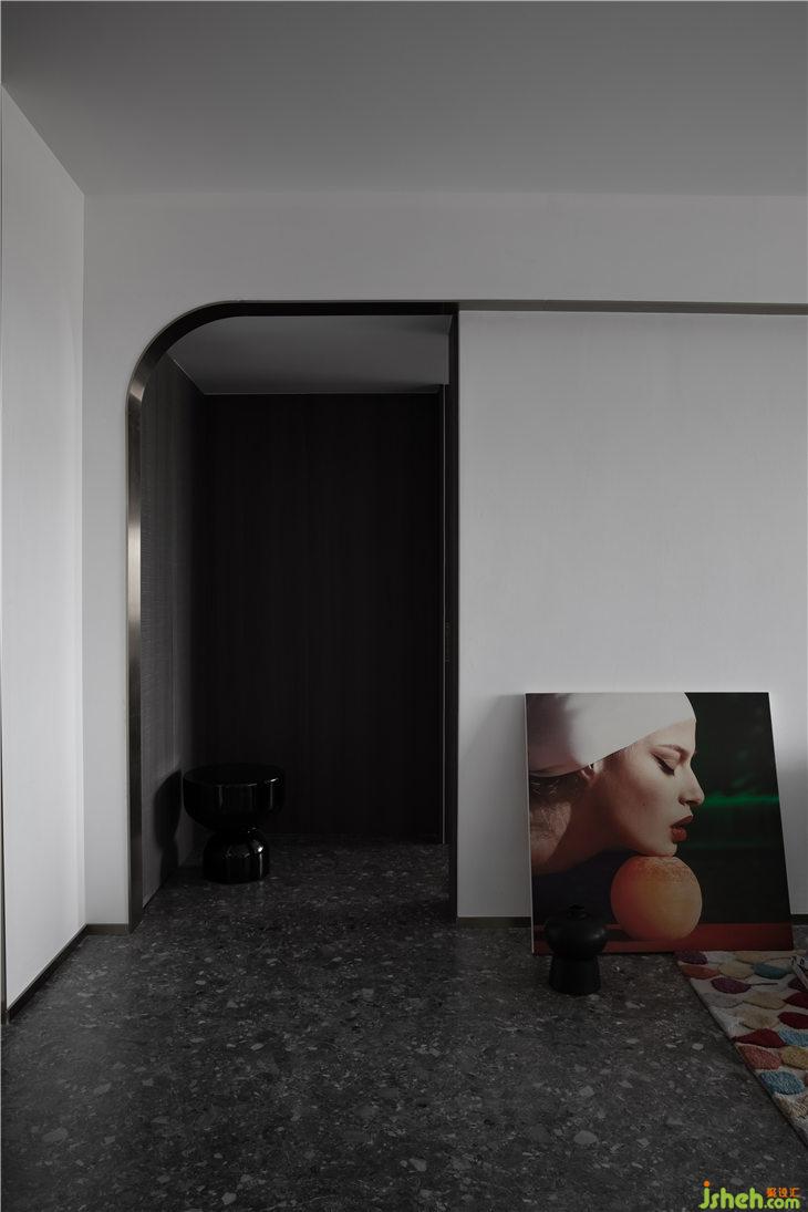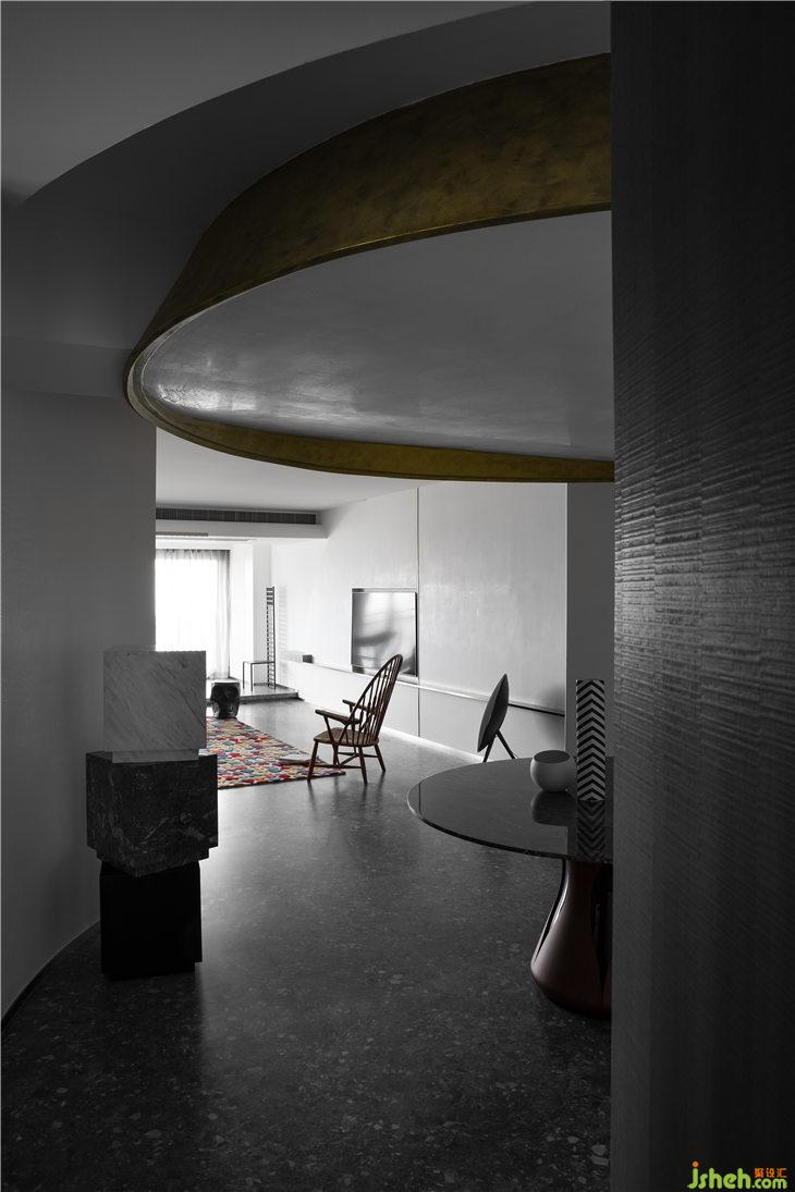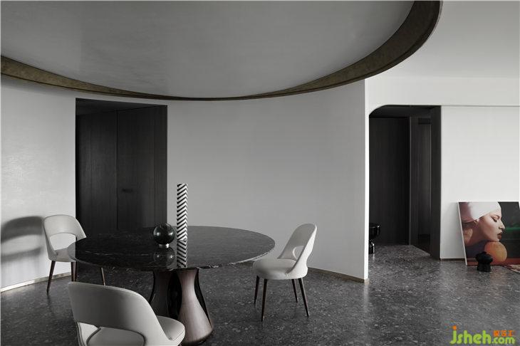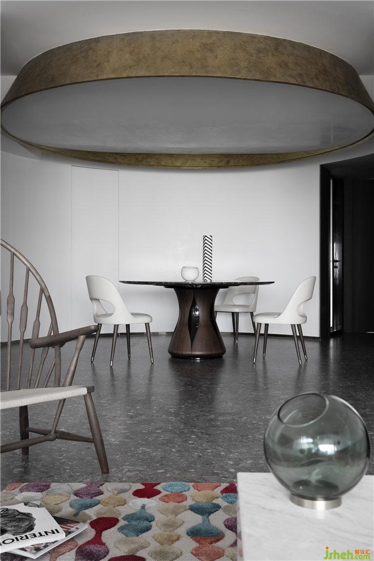客廳空間立面以白色的藝術漆為底,立面的弧線線條來呼應餐廳的圓形,強調(diào)空間的線與面的關系,通過弧形線條重塑空間的構(gòu)成美學。深灰色水磨在居家空間的運用,更加彰顯空間的獨特。平天花更好的突顯餐廳圓形的天花線條,同時有力的拉升了高挑的空間感。餐廳與客廳一氣呵成,互相融合。構(gòu)成一個熱鬧的大家庭。我們可以想象人與人之間其樂融融的生活情景。黑色的QEEBOO骷髏邊桌,色彩斑斕的土耳其進口地毯等軟裝配飾,無一不是在強調(diào)空間的俏皮與精神性。