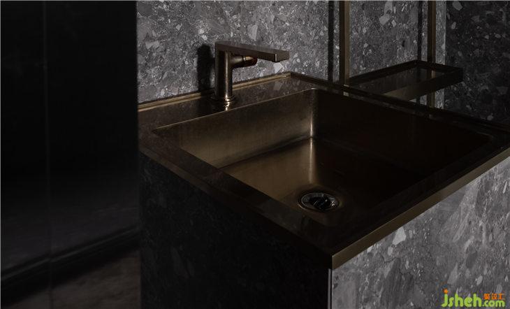 浴室以灰色水磨為底,金色不銹鋼為構(gòu)成要素,定制的手工不銹鋼盆,強(qiáng)調(diào)設(shè)計者對設(shè)計細(xì)節(jié)執(zhí)行的追求。