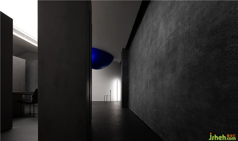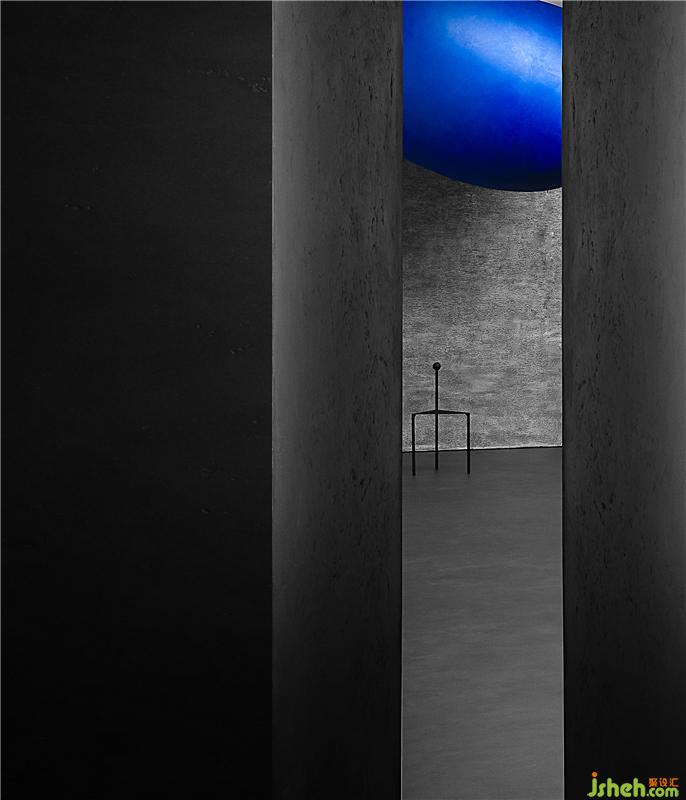 空間通過(guò)球體劃分了一個(gè)彈性的空間,這個(gè)場(chǎng)域人是空間的主體,沒(méi)有被圍合卻擁有最強(qiáng)場(chǎng)所感的區(qū)域,一個(gè)人與空間能交流的場(chǎng)所,自由的空間。裝修設(shè)計(jì)采用藍(lán)色,并與前臺(tái)的藍(lán)色相互平衡,讓兩者有一種孤獨(dú)的對(duì)話(huà)的情緒。用嚴(yán)謹(jǐn)?shù)膸缀沃刃騺?lái)構(gòu)建感性的場(chǎng)域,矛盾與協(xié)調(diào)的構(gòu)筑。