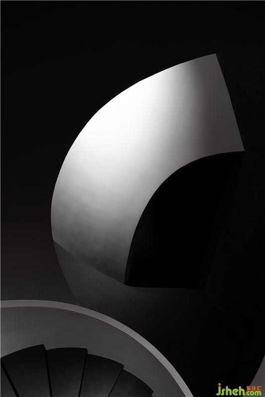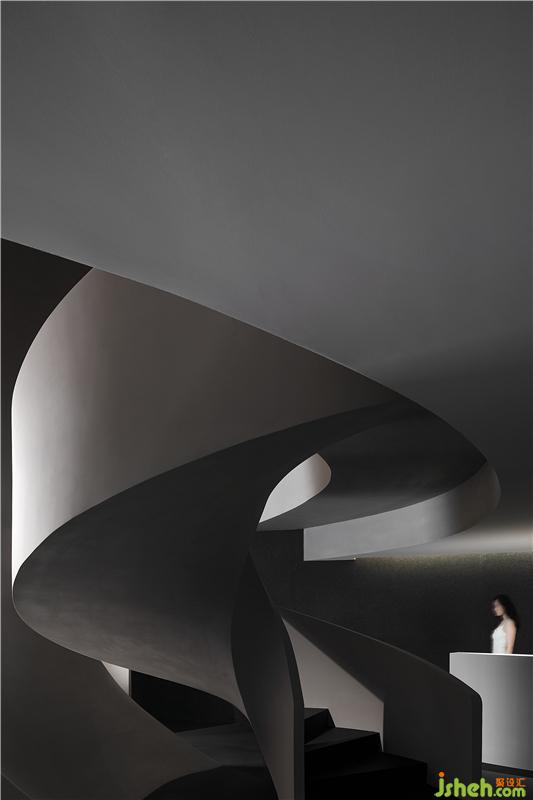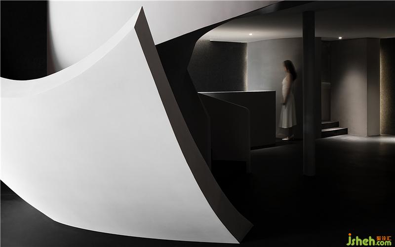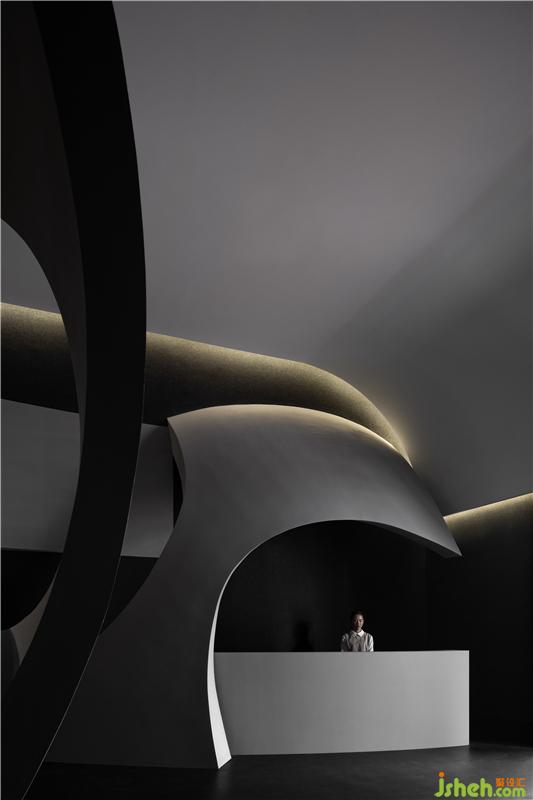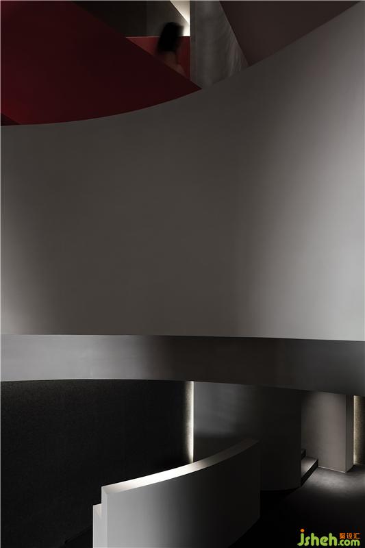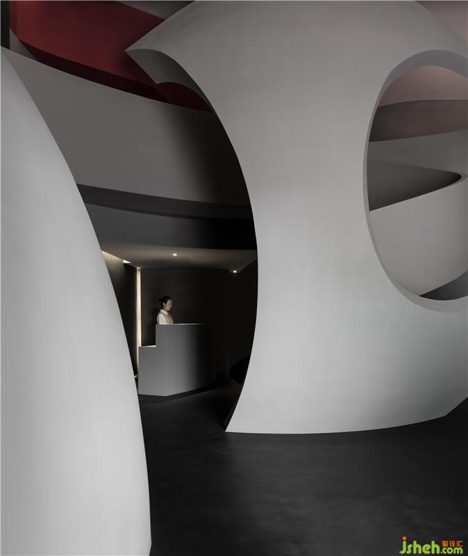 進(jìn)入空間,曲線與直線的組合架構(gòu)大型的幾何體量,厲冷的混凝土協(xié)作塑造強(qiáng)烈的沖擊感。視覺(jué)上線條的延伸交織,內(nèi)含人體細(xì)胞流動(dòng)的本質(zhì),當(dāng)進(jìn)入者緩緩而行,靜與動(dòng)的相對(duì)情境才開(kāi)始發(fā)揮作用。
