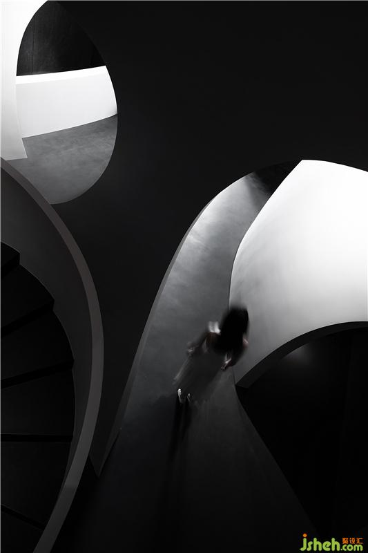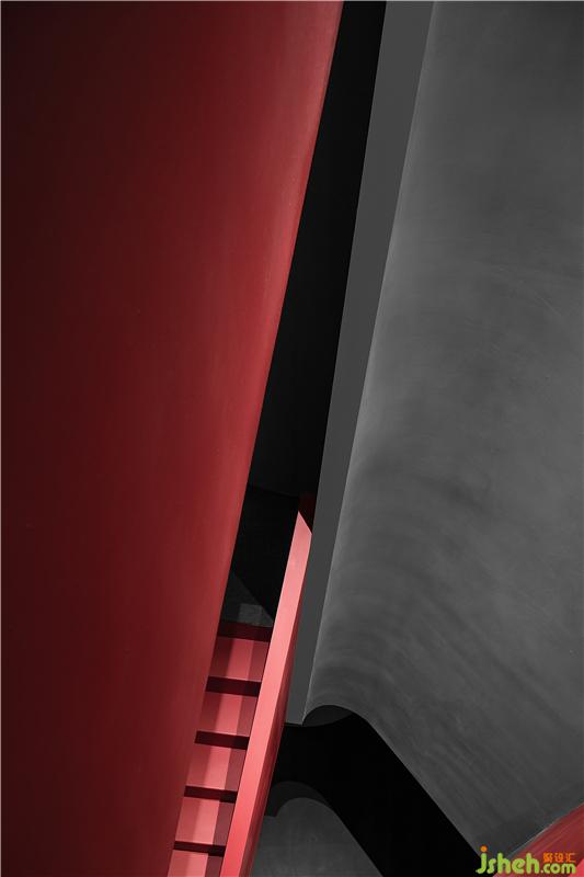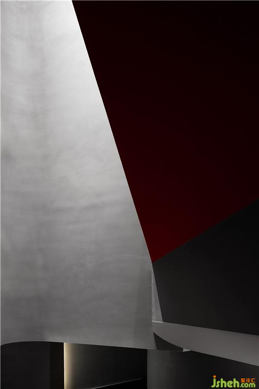 灰色與黑色鋪構(gòu)的空間基底中,暗藏一抹熱烈的“紅色”,色彩上的突變,成為空間造型之后引爆空間張力的第二個(gè)高潮。色彩應(yīng)用的巨大反差極具引導(dǎo)性,同時(shí)為進(jìn)入者留下深刻的印象。