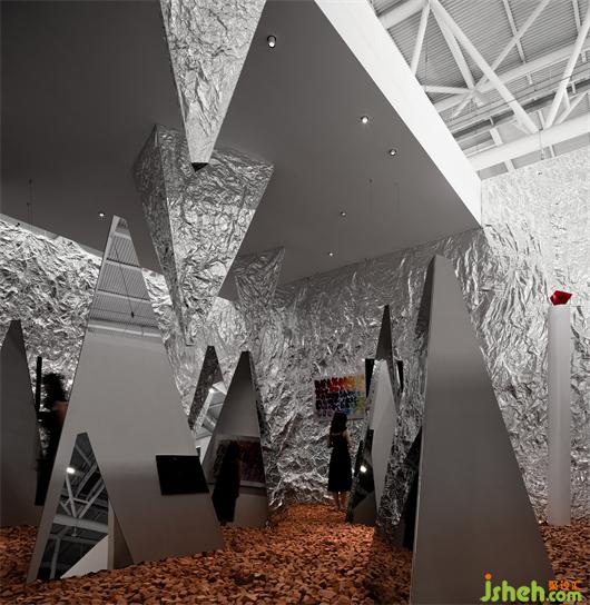展覽設(shè)計(jì)考慮到觀展的人流密集,設(shè)計(jì)通過(guò)三角形來(lái)分割空間,創(chuàng)造一個(gè)擁有自由度的同時(shí)擁有方向性的情景,其目的是更好的讓看展覽的人更好流動(dòng)起來(lái),讓本該固定的觀展流線變得自由并且節(jié)奏豐富。