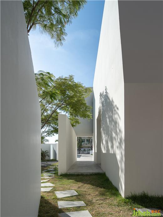 以抽象幾何為基礎(chǔ),艾克建筑又一次極簡藝術(shù)派設(shè)計語言的傳達(dá),吸引人們不自覺的想要到處走動。內(nèi)庭與外院讓人停留與聚集,傳統(tǒng)的院落用當(dāng)代的形式呈現(xiàn),空間里與外、建筑與環(huán)境、建筑與人都在產(chǎn)生互動,打造一個以人為中心的藝術(shù)空間。