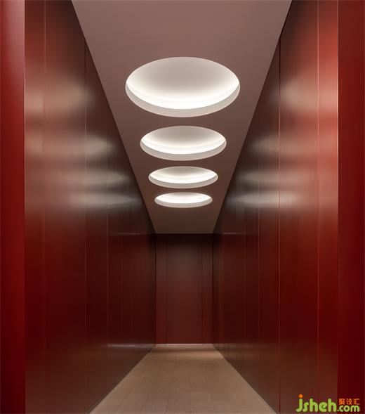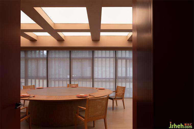 Up to the second floor, what comes into view first is the multifunctional area composed of the reception counter and water bar. The open terrace enjoys a pleasant ambiance. The contemporary geometric form above the bar counter contrast with the handmade rattan furniture and outdoor woven structures, creating a space atmosphere that encourages people to explore through the use of geometric symbols. The bold yet restrained design generates the collision between Eastern and Western aesthetics and philosophy.