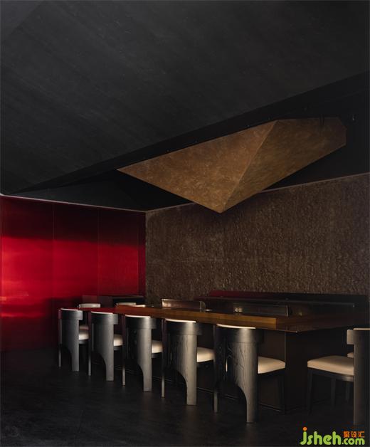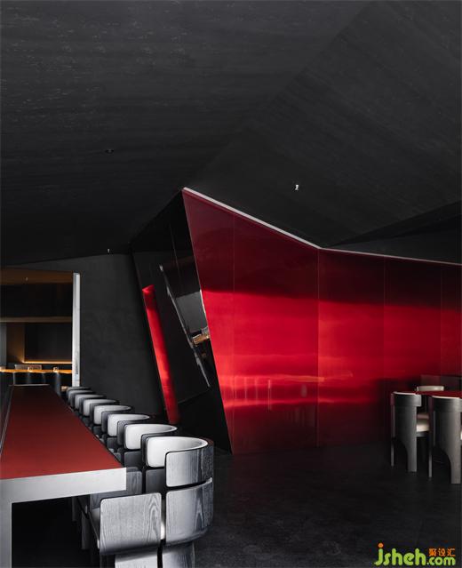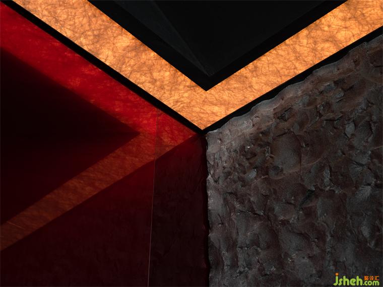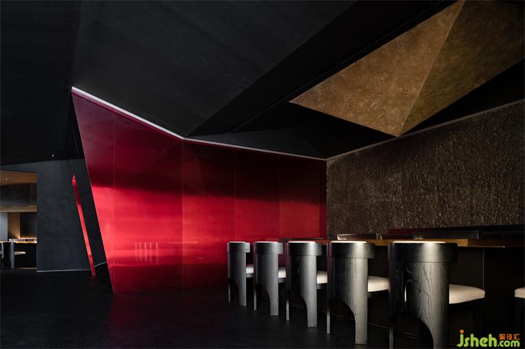 華燈初上,燈火一星一點(diǎn)亮了起來,門上的“虹”字LOGO面向燈火輝煌的商業(yè)區(qū),反射出燦燦金光;鐵板料理設(shè)計(jì)像是黑暗中出現(xiàn)火焰的光亮,影影灼灼,引導(dǎo)著尋訪來此的人;光影交落漸淡漸現(xiàn),又平添幾分望不穿的朦朧交織與神秘未來感,戶外就餐花箱區(qū)植被為產(chǎn)品動(dòng)線賦予氧氣。