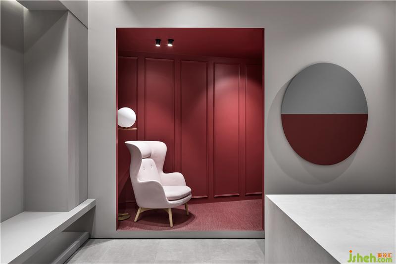 熱烈的紅色系填入內(nèi)嵌式的展示位,與素凈的家具形成冷暖對比,猶如電影鏡頭里的布景片段,卻又是真實可達(dá)的線下體驗區(qū)。