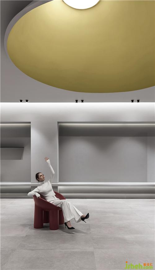 圓形的語匯也延續(xù)至主空間的黃色結(jié)構(gòu),如天外之物嵌進(jìn)天花,構(gòu)成巨型的裝置藝術(shù),借助燈源營造天光效果,自然而然地升華著儀式感的氛圍。展廳設(shè)計
