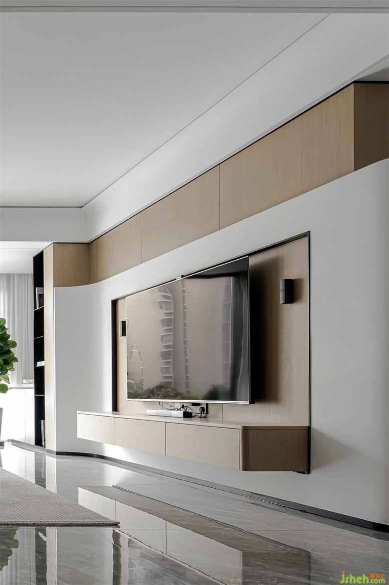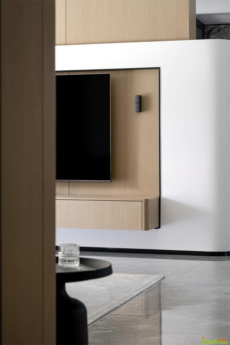 The blend of colors creates a unique space rhythm in the simple shape. The suspended TV cabinet and the background wall with great aesthetic temperament describe the vivid natural interest. The wood veneer and the white wall panel are spliced together, and the interface is softened with a delicate arc, guiding the line of sight to a more comfortable perception dimension.