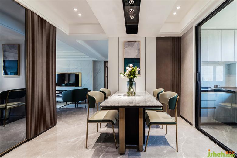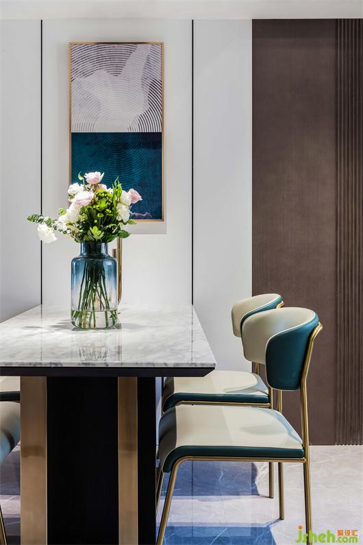 客餐廳整體空間為中性色系,線條簡潔硬朗,簡約灰的背景色,奠定了空間低調(diào)的質(zhì)感、優(yōu)雅的基調(diào)。家居設(shè)計巧妙搭配自然質(zhì)感紋理的大板磚以及金屬元素,點(diǎn)綴墨綠色系的軟裝猶如從室外悄悄攀爬而入的生命氣息,賦予空間生動輕靈的魅力。再搭配深色木飾面,調(diào)和室內(nèi)柔軟氛圍,讓空間多了分適合居家生活的怡然自得的溫馨感。