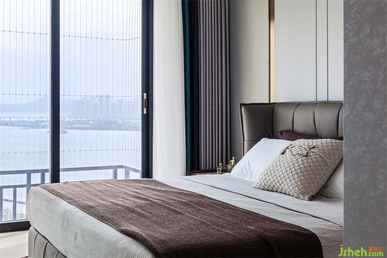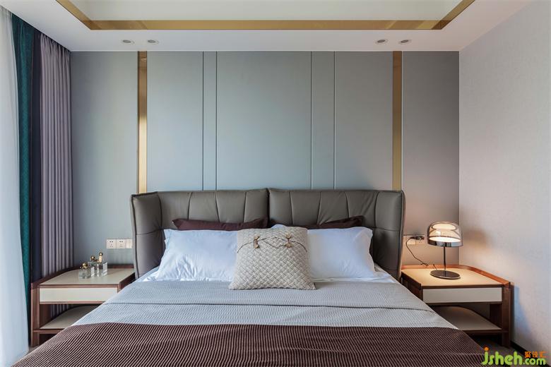 主臥淺灰色嵌上金色線條的背景墻,唯美的藝術(shù)吊燈,搭配墨綠色的窗簾及矮凳,散發(fā)出來充滿優(yōu)雅質(zhì)感,由內(nèi)而外散發(fā)出不可抗拒的魅力。