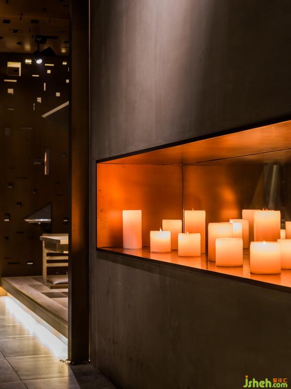 在這里,銹板和銹紅代表傳統(tǒng),水泥和灰色代表現(xiàn)代。這是時(shí)間的交疊。與烤肉不可分割的燒酒文化,以一道綠意晶瑩的酒墻出鏡。這就是文化的暗喻。