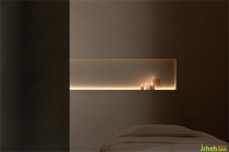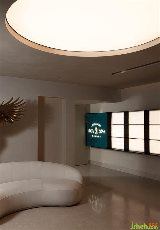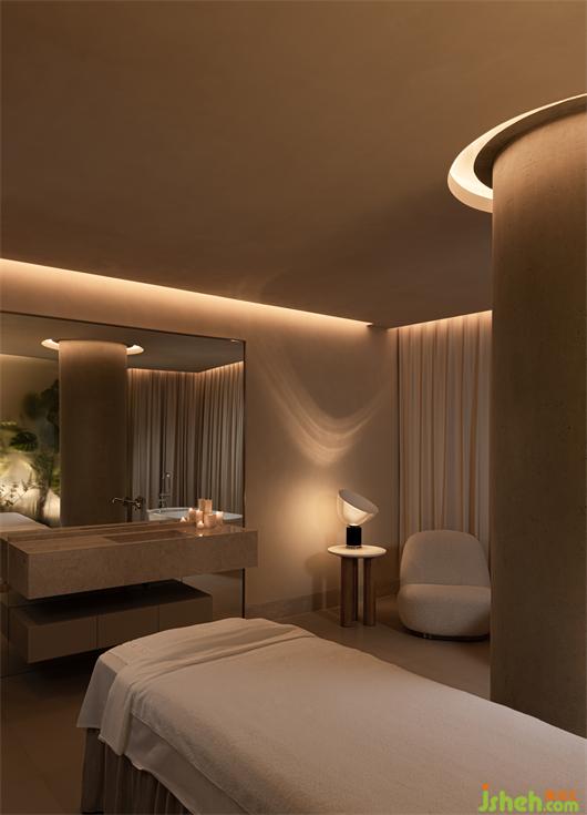 一束陽光穿過白色紗幔,融化在水霧之中,SPA設(shè)計將記憶拉回到那一方塵土。水晶磚、原木、原石、室內(nèi)留白和浮光掠影,讓空間無形中生出神性的侘寂之美。