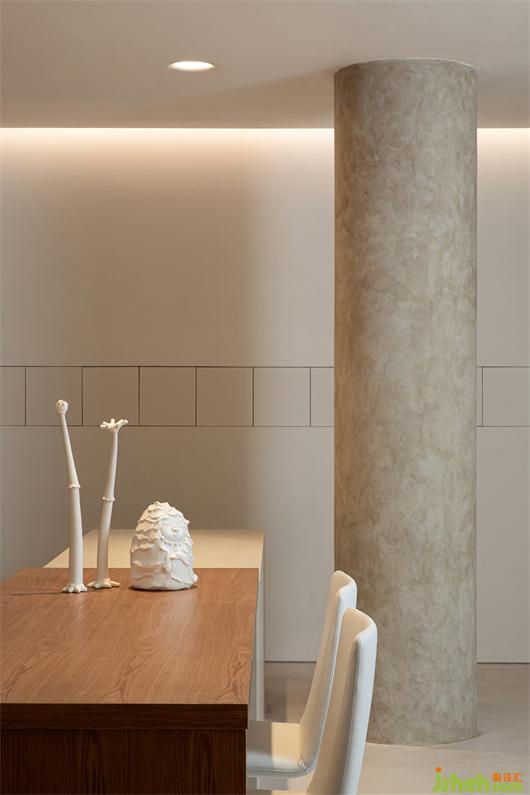 寬敞明亮的開放式廚房也很有藝術(shù)氣息,原木與水泥組合的定制吧臺、整體隱藏式櫥柜、以及白色餐椅讓整個空間變得極簡大氣,極度舒適溫馨。