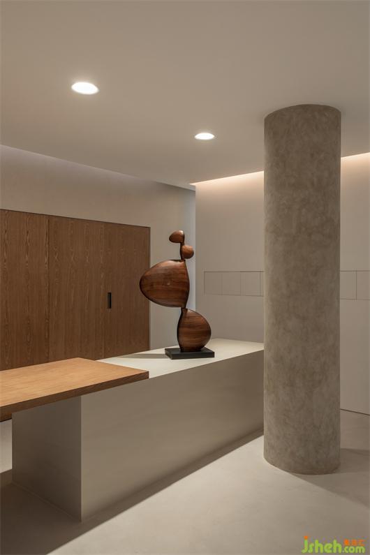 整個室內(nèi)所有布置都構(gòu)成一種既對立又統(tǒng)一的手法,客廳中沙發(fā)采用的是沙色麻料,茶幾則是黑胡桃與古銅的搭配,壁爐則以銅板鑲嵌,書房金屬書架彰顯著品質(zhì)感。展廳設(shè)計在清水混凝土的底調(diào)下,所有的物品都有著各自的性格和特色。