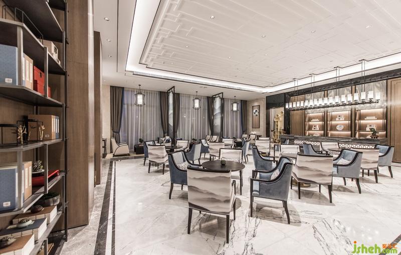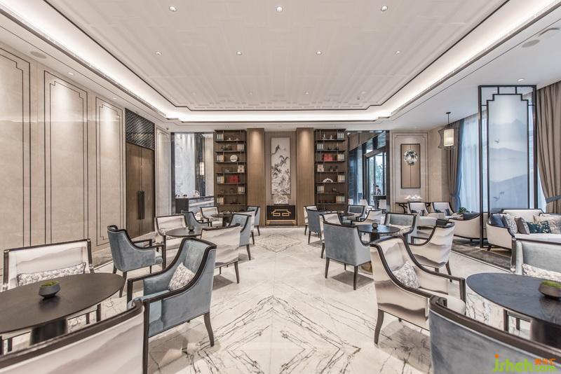 而洽談區(qū)藍白相間的洽談椅靈感來源于這座城市被低山丘陵包圍獨特的地貌,高級定制的水墨山紋與面料與水墨藍的凈色面料相搭配,意在營造一個藍天白云,好山好水的中式閑適意境空間,給人一種山水景色的帶入感。