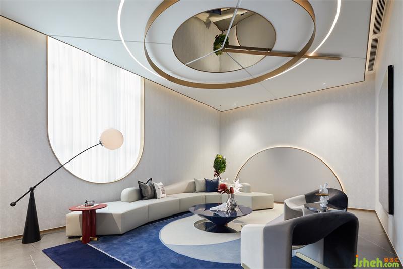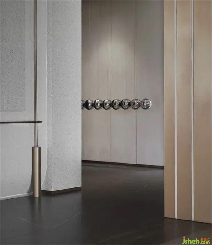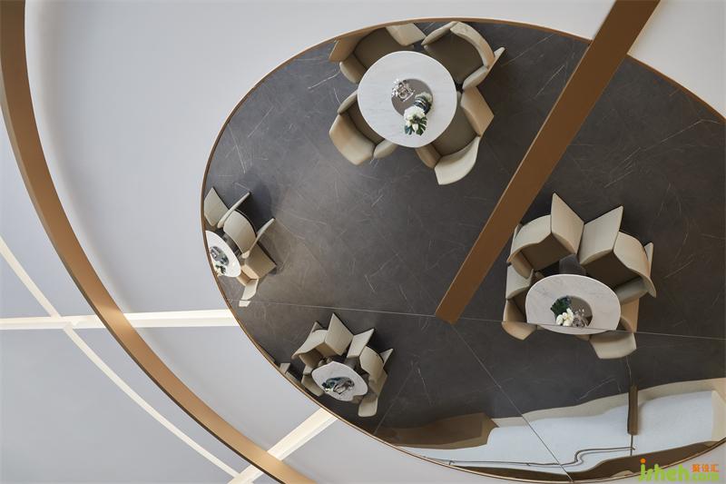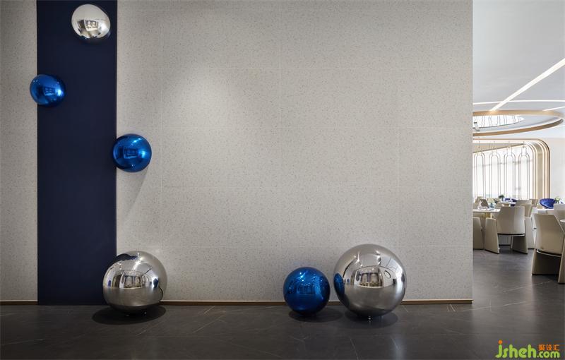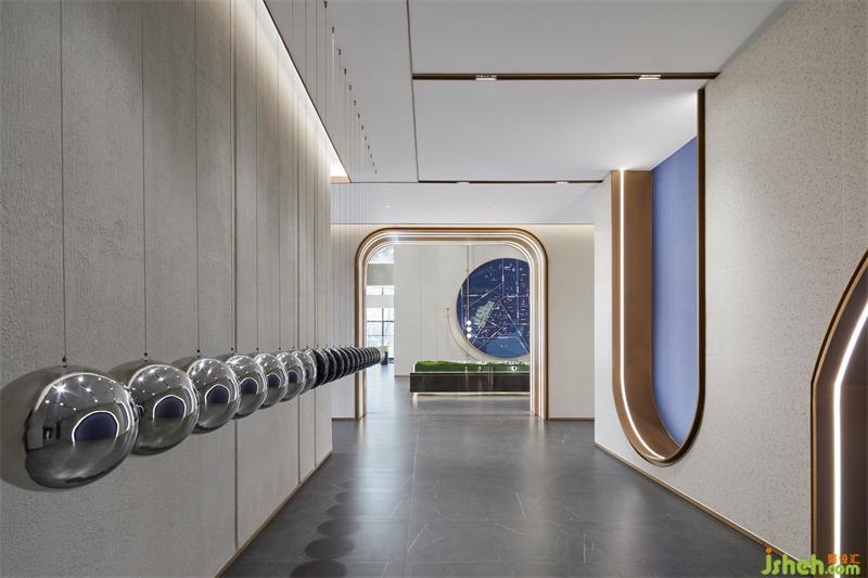 財(cái)務(wù)區(qū)硬裝墻面造型豐富,設(shè)計(jì)師以細(xì)膩的思考策略,售樓處設(shè)計(jì)將鍍色的不銹鋼圓形與半圓形球體結(jié)合,在藝術(shù)化的表達(dá)下從地面自由延展到頂面,形成空間視線的律動(dòng)感,賦予空間生命力。