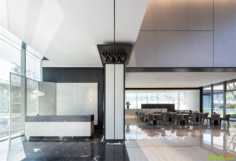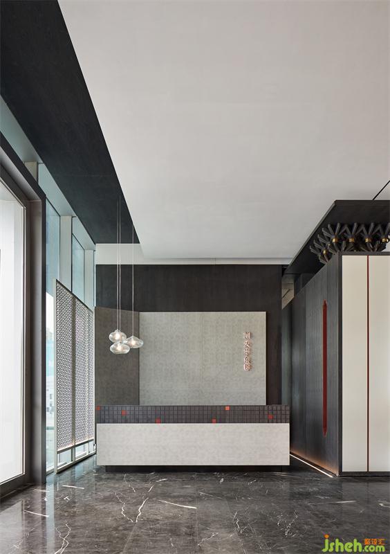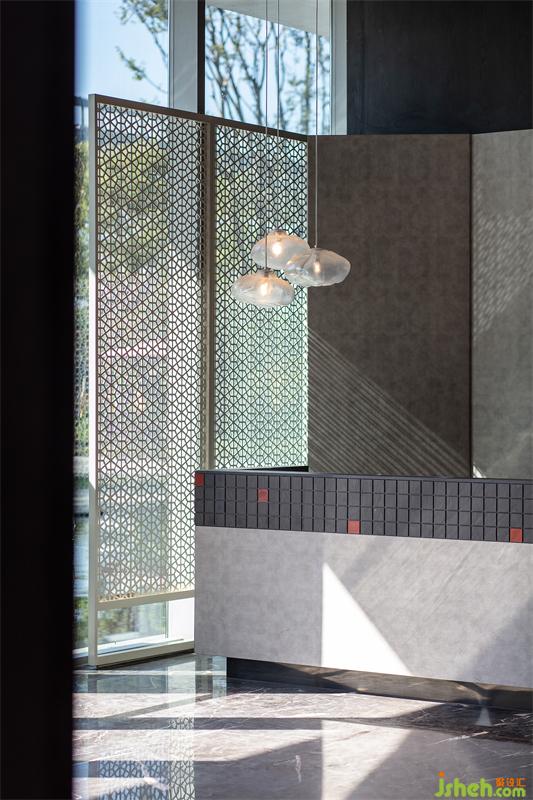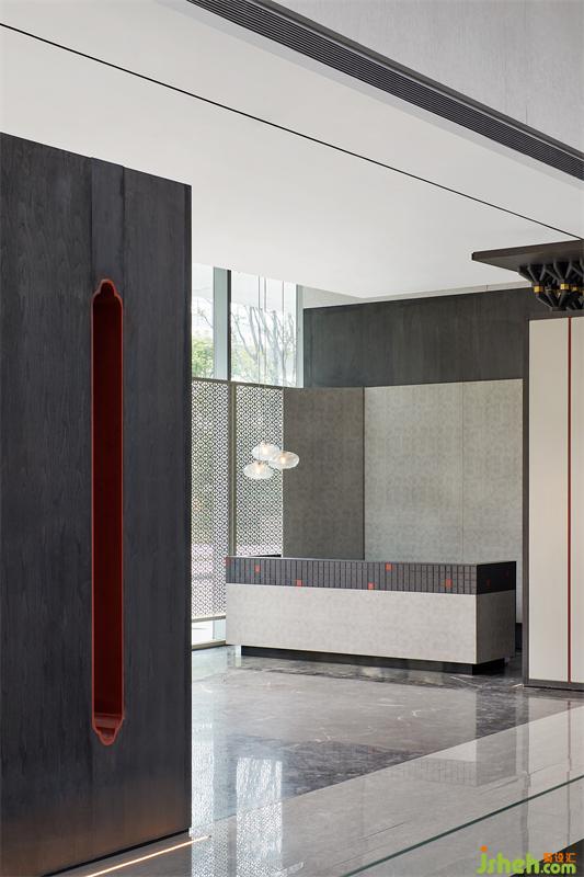 室內(nèi)設(shè)計(jì)師從嶺南園林中的代表作「余蔭山房」中汲取靈感,提取斗拱、門扇、窗格、夾墻翠竹等傳統(tǒng)元素,結(jié)合現(xiàn)代設(shè)計(jì)手法,采用抽象的形式,旨在打造一座具有東方氣質(zhì)的現(xiàn)代售樓中心,帶給人們一種愜意、簡雅的生活體驗(yàn)。