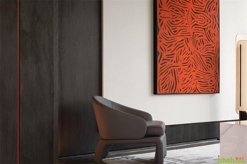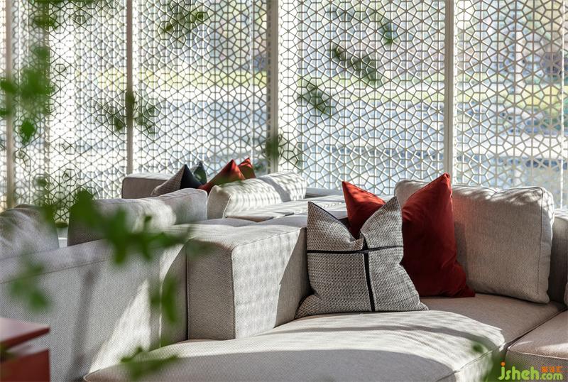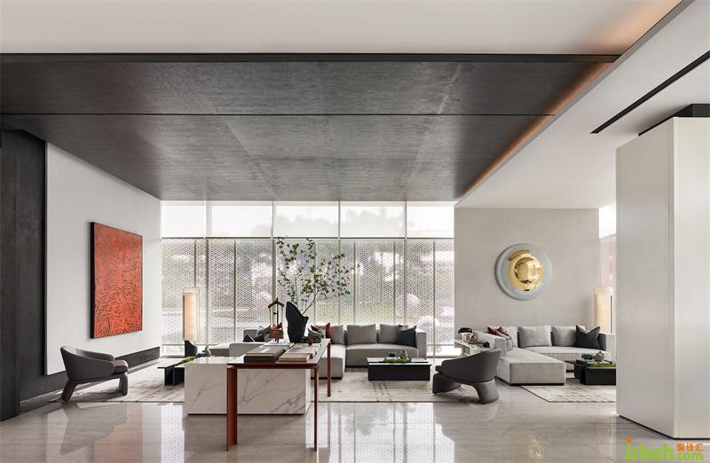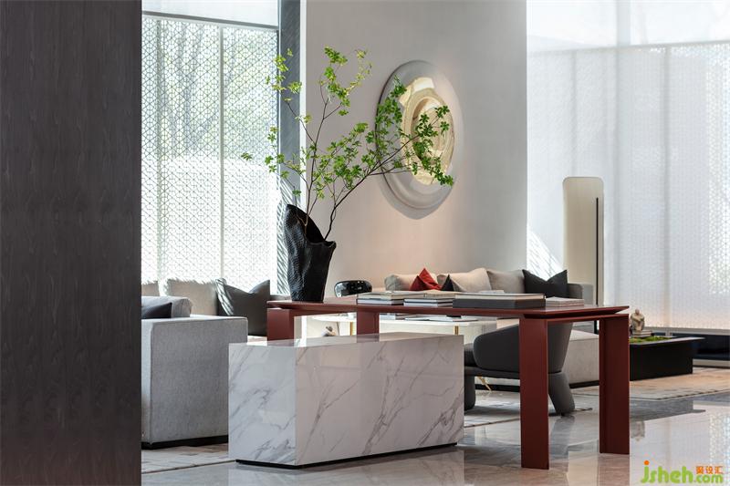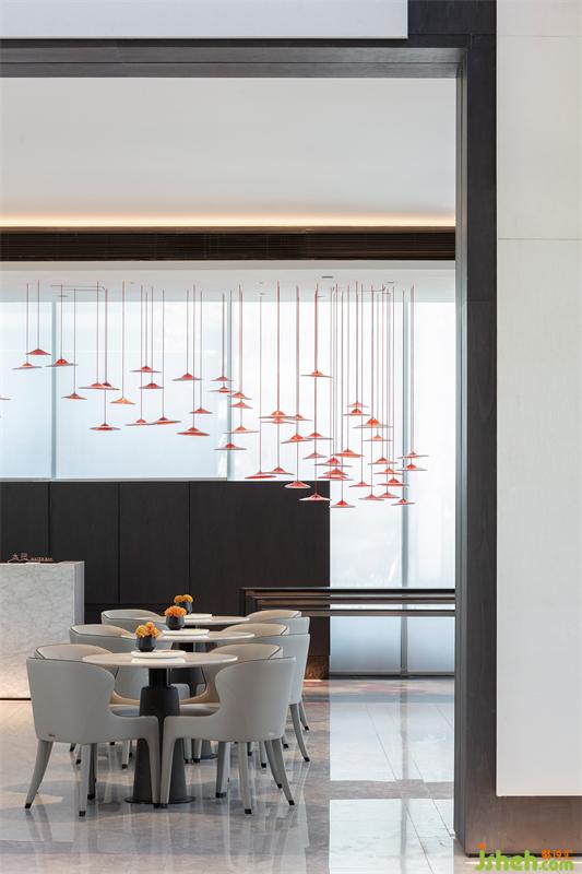 園林的湖水化作一簾紅雨,售樓處設計傳統(tǒng)與現(xiàn)代靜默交織,為素雅的空間增添靈動之感,讓人在自然行進之中,感悟藝術心境。