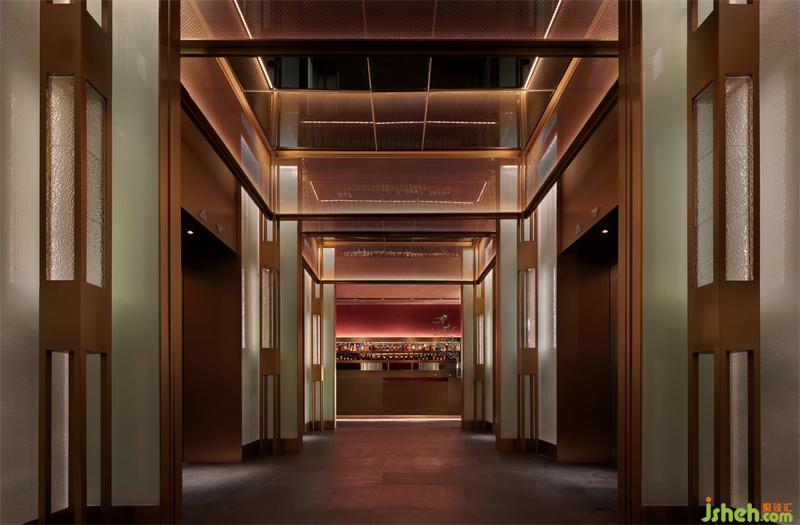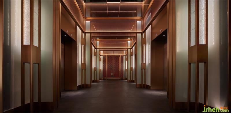 入電梯廳,白青色的夾絲玻璃呈現(xiàn)玉面的質(zhì)感,來自空間兩端的紅色肌理墻,透過漫反射暈染著電梯廳的每一處角落。四根金色立柱從地面延伸至鏡面的天花,與金屬網(wǎng)框交織,無限延展,循環(huán)往復(fù),無盡空間。