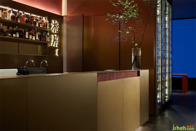 局部展露的服務(wù)臺暗示了下一個(gè)空間,形體由金屬塑造包裹的墻壁,完成“形”與“間”虛實(shí)轉(zhuǎn)換,自然過渡。從接待廳行進(jìn)至包廂走廊,依然由三個(gè)空間組成,循序漸進(jìn),空間尺度依次遞減,照度逐步降低,旋律漸漸平緩,遠(yuǎn)離喧囂,回歸寧靜。