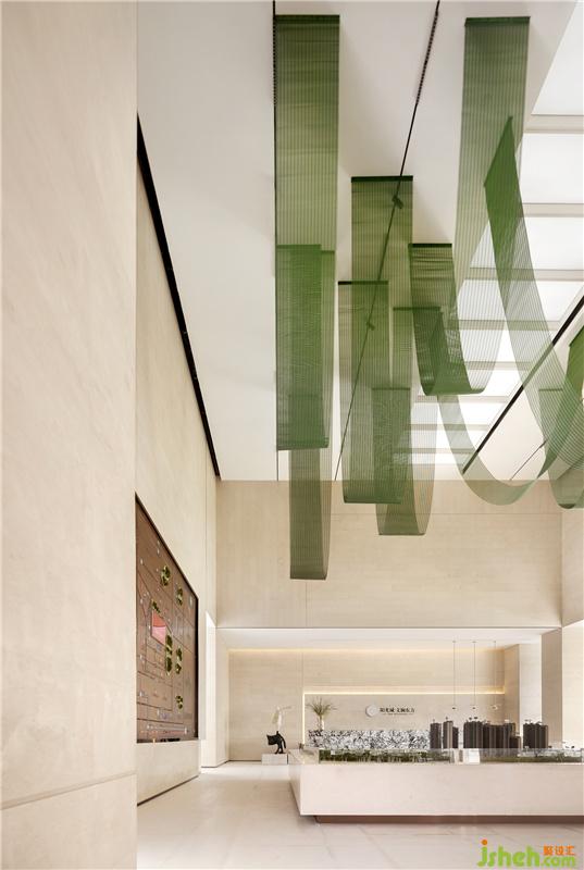 城市脈絡(luò),敘事的美感源于裝置和藝術(shù)品點(diǎn)綴,從客觀實(shí)體的物質(zhì)性到使用者接觸與使用界面,綠色和米黃色的空間朦朧穿梭為整體的敘述核心,將山體的形態(tài)抽象至空間之中,豐富了空間的形態(tài)并為人與景增添了多元的互動(dòng)可能。