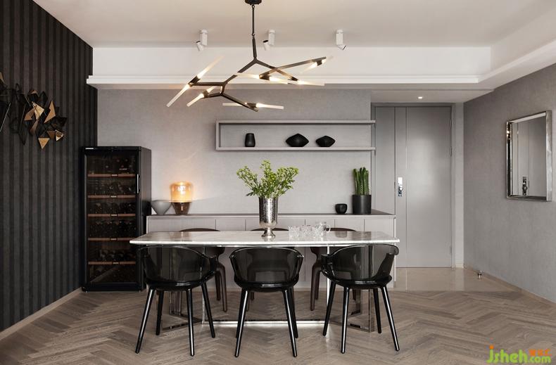 設(shè)計(jì)總是在不經(jīng)意間一點(diǎn)一滴的充滿了生活,開放式的餐廳,石材臺(tái)面的餐桌,金屬桌腳,黑色透明亞克力座椅,銀色金屬花器隨意盛放的鮮花,性感而不失生活的味道。