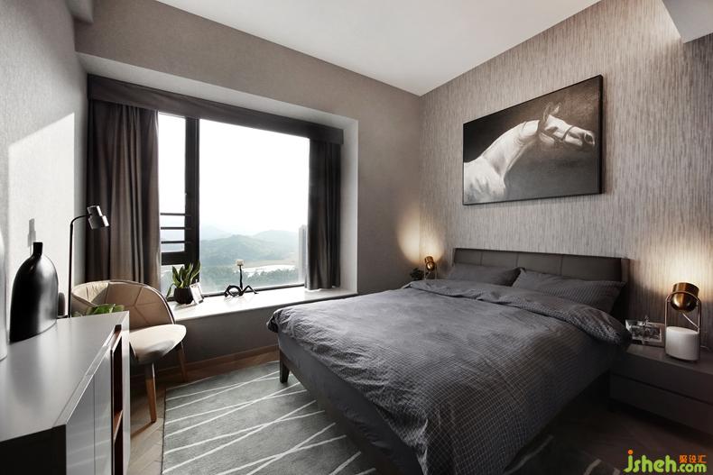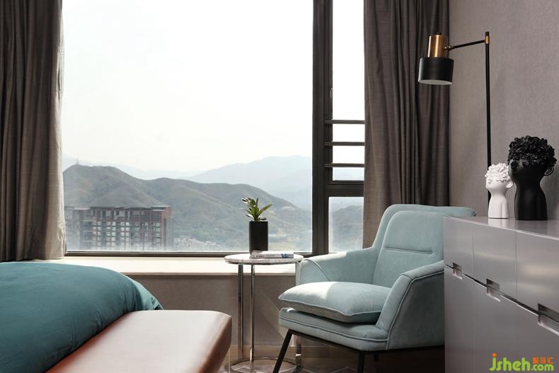 房間延續(xù)了客廳的灰色調(diào)風(fēng)格,室內(nèi)設(shè)計(jì)師搭配明亮的墨綠色以及透明腳的床頭凳,既帶有現(xiàn)代女性之美,又將生活藝術(shù)化。