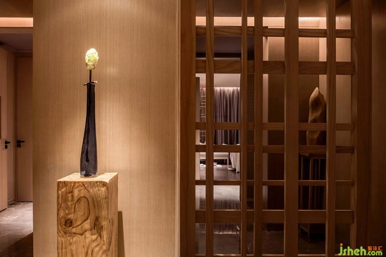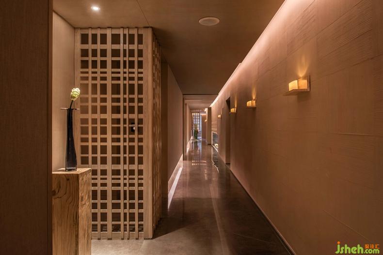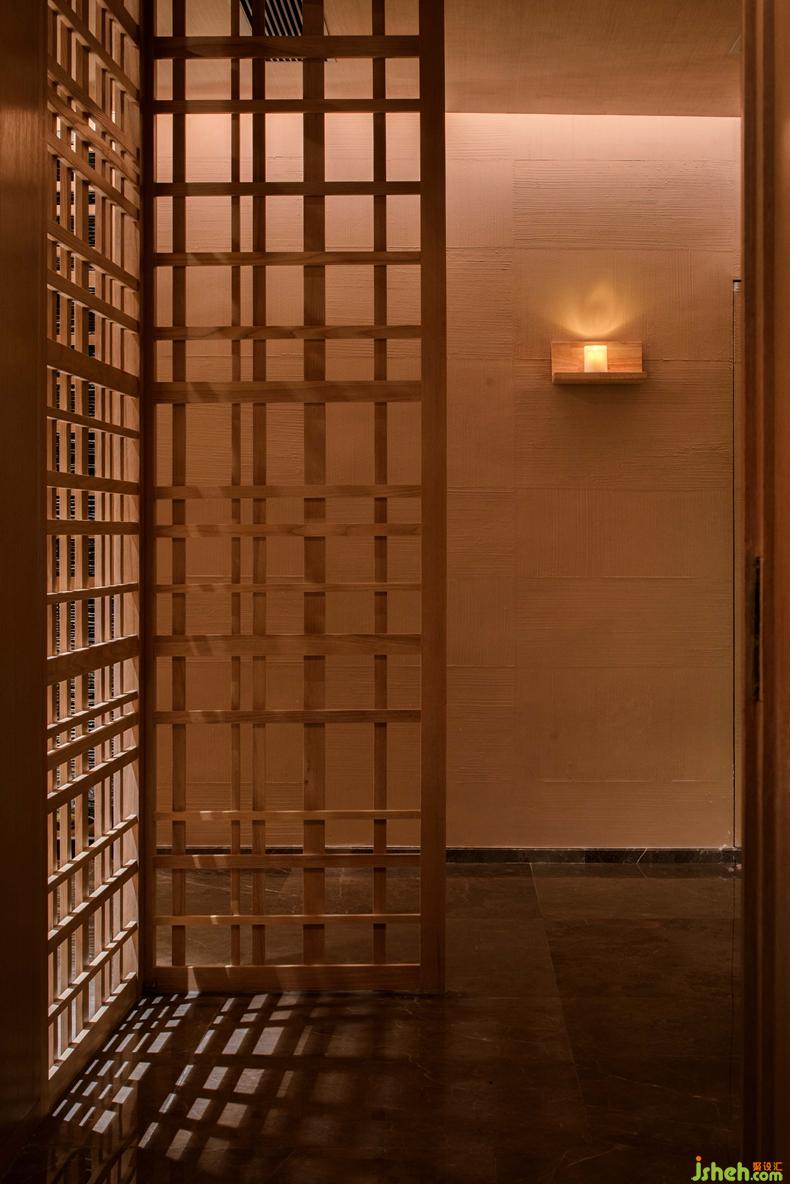 通往SPA區(qū)的廊道與前廳用4扇自動木格柵門連接,走廊墻壁上燭火搖曳,似有風(fēng)從盡頭而來,柔和的燈光穿過寬窄不一的木格柵,光影交錯,讓人一眼望不真切。