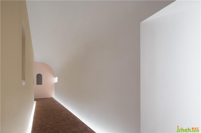 待客區(qū)主要展示品牌文化,設(shè)計(jì)師將天花、地面、墻面色彩統(tǒng)一定為白灰色系,從視覺上將三維空間扁平化、純凈化,再從墻面剪出幾個(gè)弧形門洞,透過門洞透出里面多彩的世界,交叉重疊,吸引小朋友停留駐足,將視線不斷引至下一個(gè)空間。