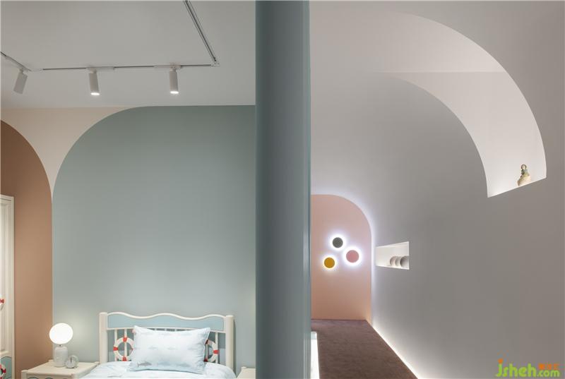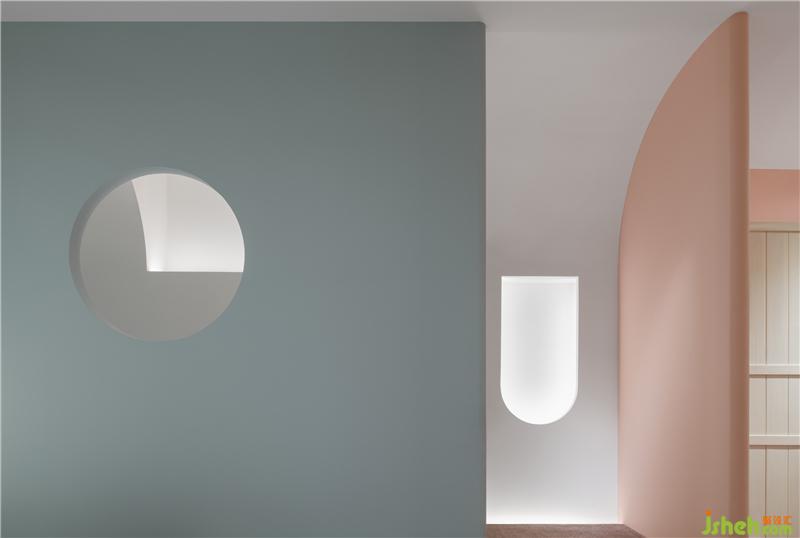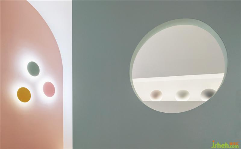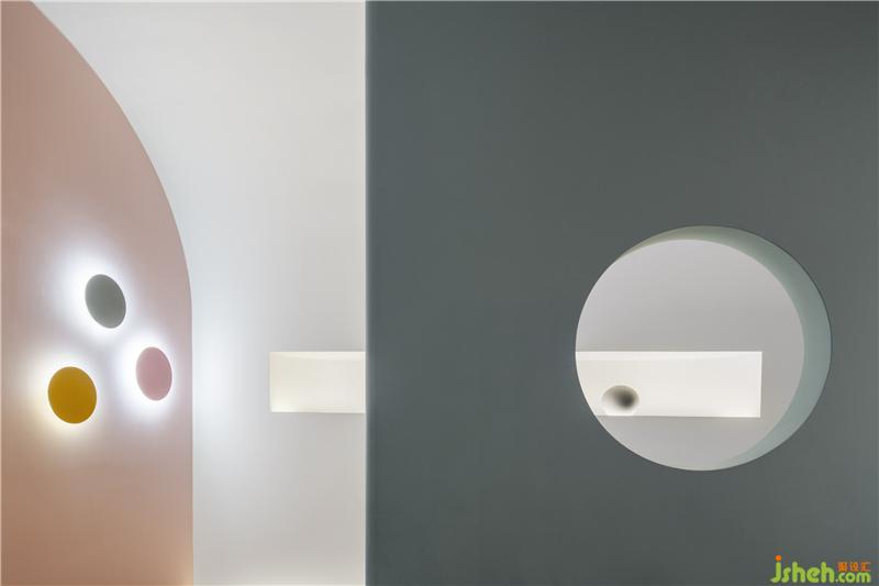 穿過時光廊便是彩色家具展區(qū),產(chǎn)品顏色或粉或藍(lán)或綠,色彩繽紛,于是墻身選用了雪青灰做底襯。