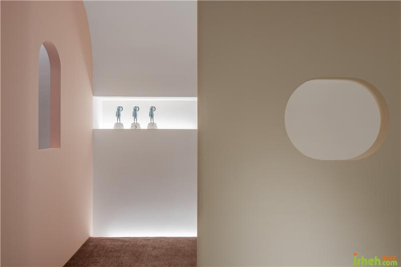 踏上廊道,讓人對下一個展示區(qū)充滿期待,它的底打光直至半弧的天花,柔和而夢幻,行走的途中可以在窗口回望、招呼,讓人與人、人與空間互動,家具展廳設(shè)計空間變得更有趣了。
