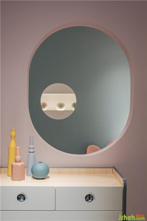 以空間即雕塑的理念在展廳中間加一低墻,結(jié)合產(chǎn)品做了跳色,挖了些窗口、門(mén)洞等造型,行人需從中穿過(guò),空間似隔非隔,又讓孩子們體驗(yàn)到捉迷藏的游樂(lè)感。