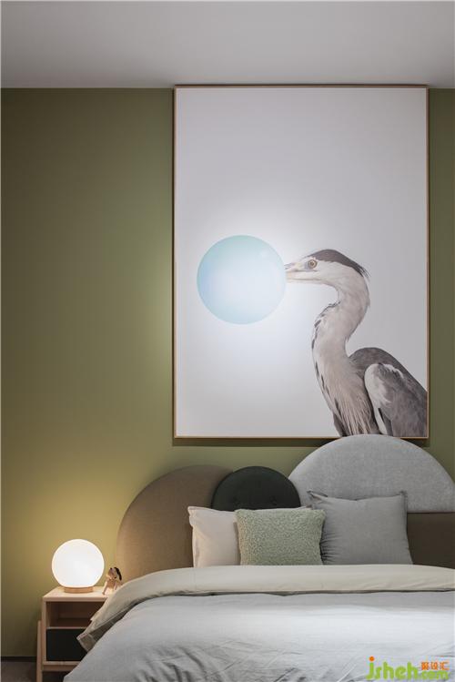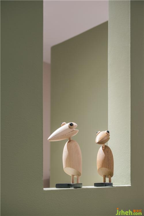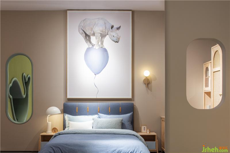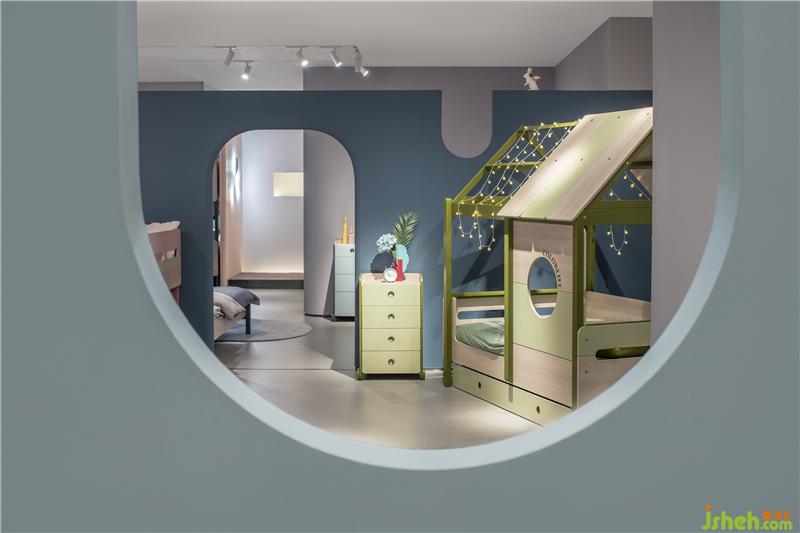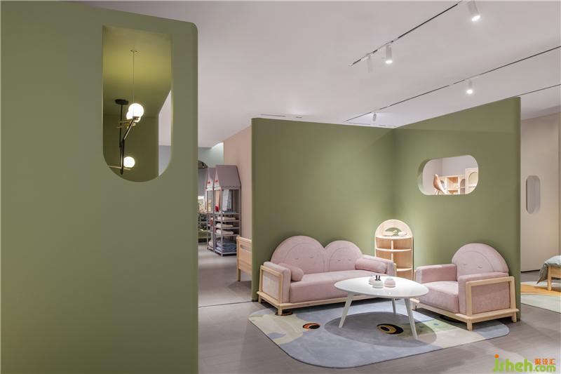 穿過(guò)床墊區(qū)可見(jiàn)一柔和氛圍,這便是原木家具展區(qū),原木有著天然的親和力與溫潤(rùn)的質(zhì)感,墻身選用象牙色讓空間變得安靜,枯綠色的雕塑墻豐富了空間層次,配上俏皮可愛(ài)的動(dòng)物畫(huà)、動(dòng)物小木偶,家具展廳設(shè)計(jì)讓寧?kù)o而輕松的空間氛圍添了幾分童趣。