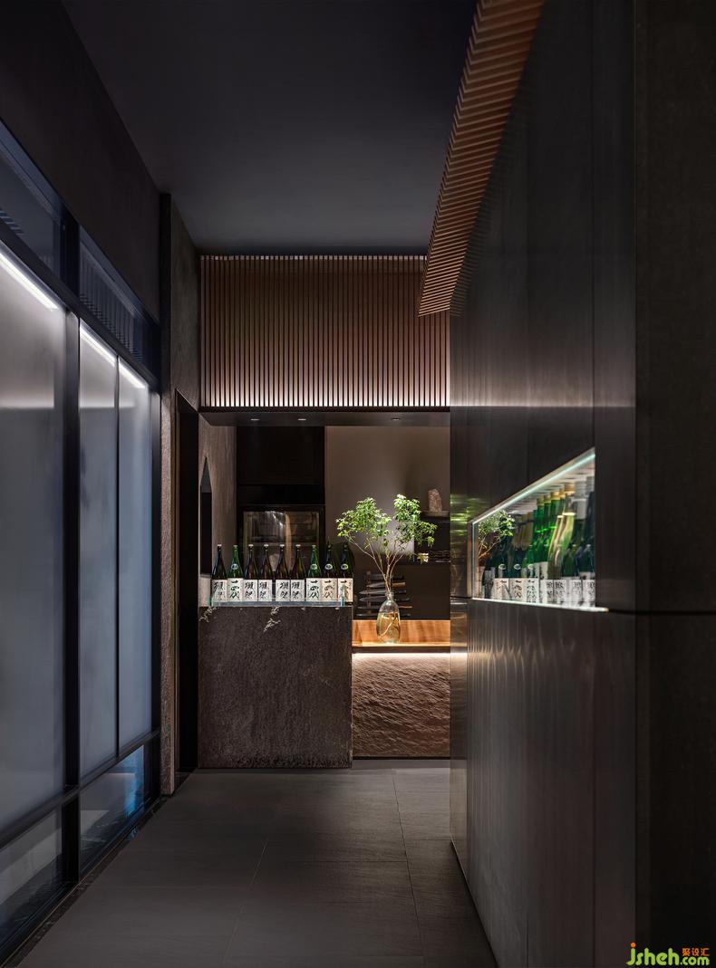 自低矮的屋檐下穿過廊道,迎面便是刺身臺。日料餐廳設(shè)計取材于自然之中,刀劈斧鑿,大巧不工,原石原木的天然質(zhì)感與食物的原汁原味相輔相成。