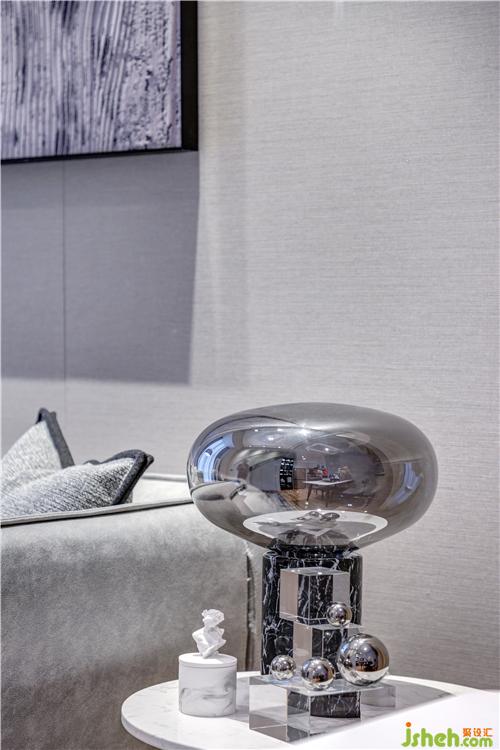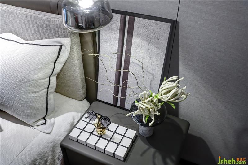 樓上的臥室也延續(xù)了整體的高級灰色調,用金屬色作點綴