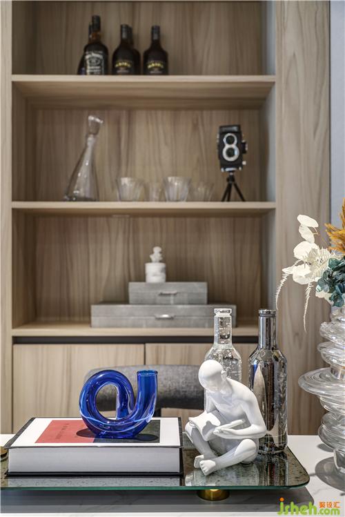 以深灰、淺灰、藍、白的家飾交相疊印