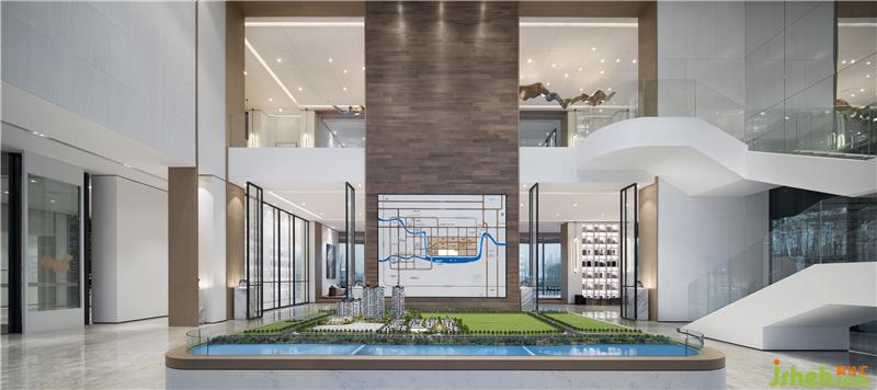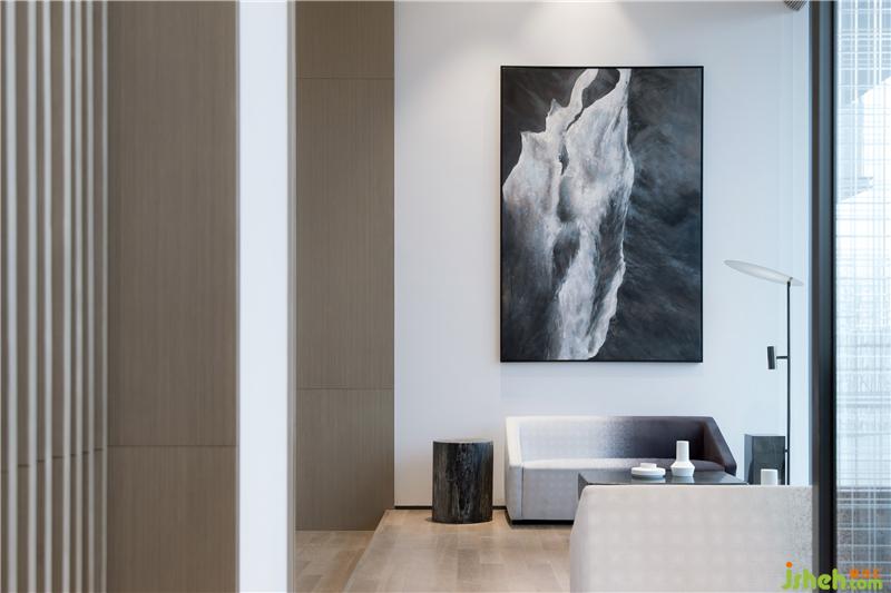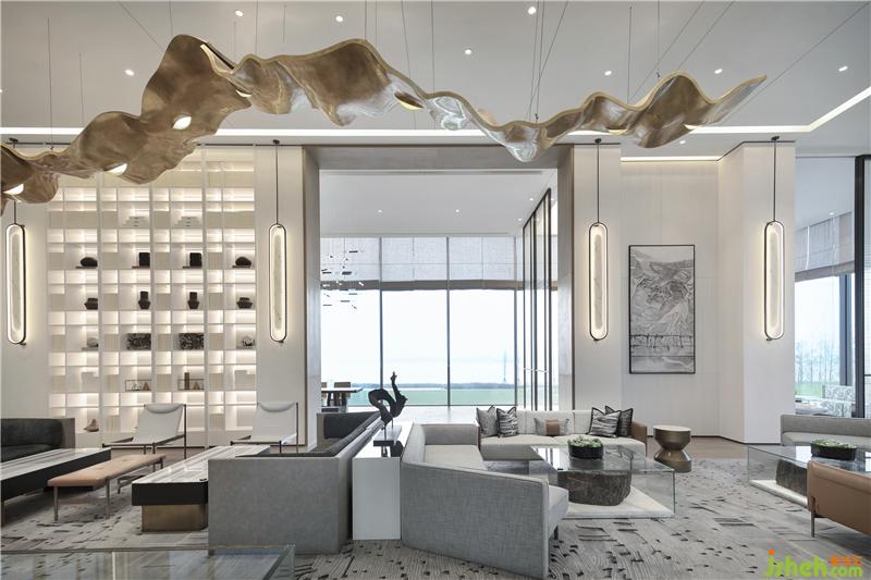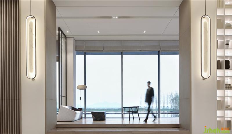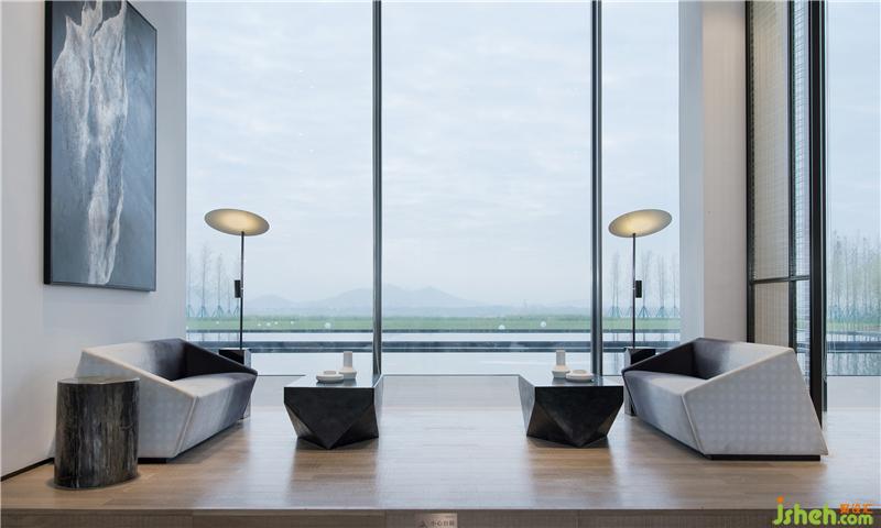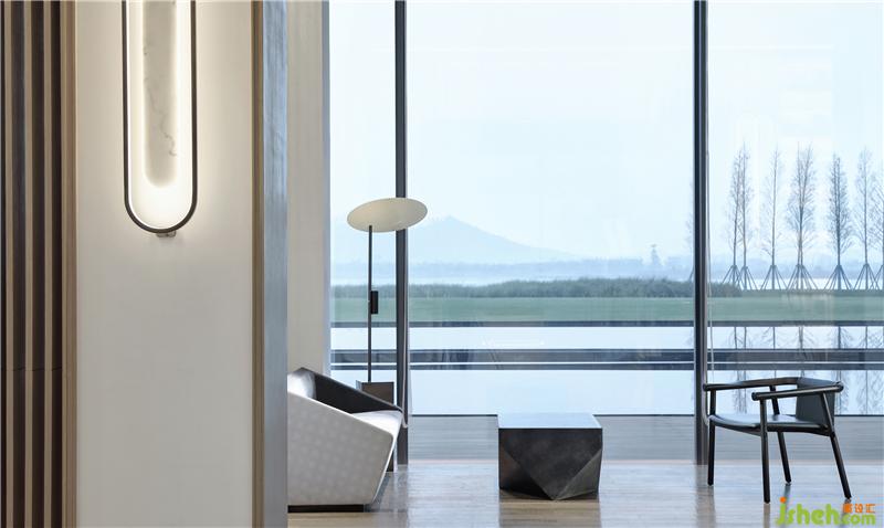 從沙盤區(qū)經(jīng)展廳至休息區(qū),開闊的視野望出去,山、水、田野皆入眼底。一窗之隔,黑白或漸變的顏色,極簡的筆觸勾勒出讓人寧靜的幾何線條。天、地與人的和諧, 在厚重的山石與靜淌的流水間滲透,動(dòng)與靜,柔與剛,于空間之中靜默交流。