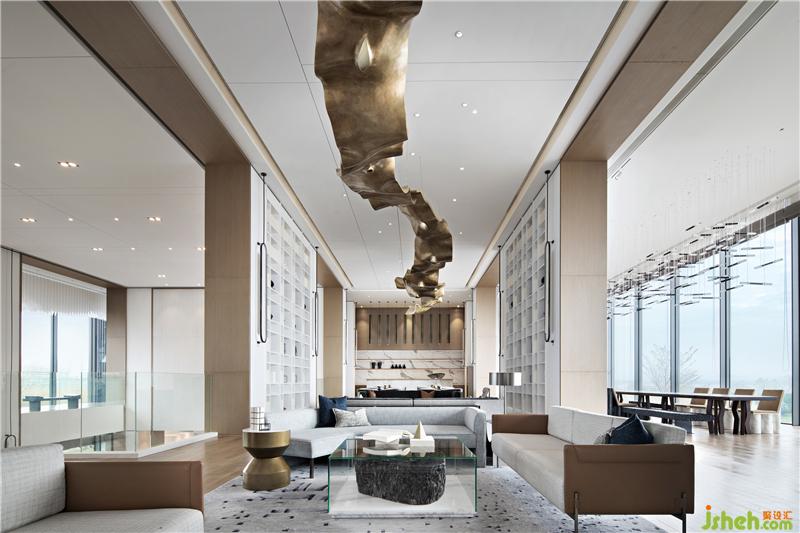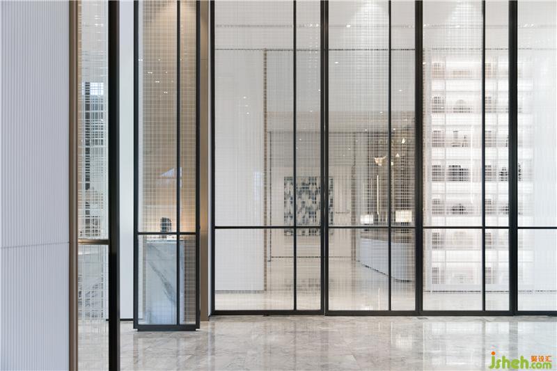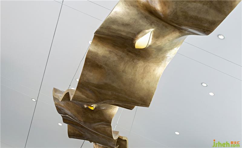 行走在空間里的人們,總在尋找新的視覺記憶點(diǎn)。如同觀看一幕戲劇,導(dǎo)演試圖在不同的時(shí)間節(jié)點(diǎn),通過對劇情節(jié)奏的把控和設(shè)計(jì),令觀眾始終保持興趣盎然。藝術(shù)和戲劇都需要哲學(xué)思辨,在對比中產(chǎn)生沖突,厚重的黃銅材質(zhì)做出飄帶一般的輕盈感,微光從裂縫中透露出來,引發(fā)人們對于自然力量的想象。