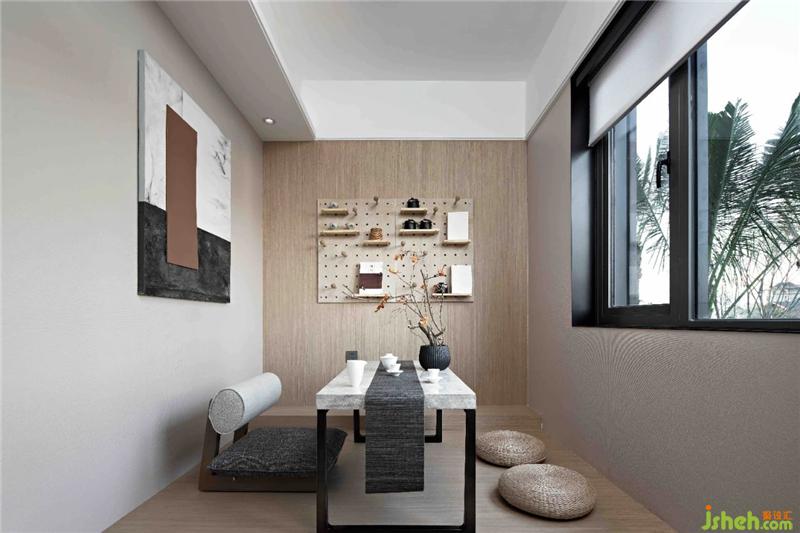 茶室盡顯中式儒雅,契合居者對禪意生活的向往與追求;桌腿的矩形設(shè)計打破傳統(tǒng)的條形桌腿的刻板印象,與弧形椅背形成巧妙的視覺差。