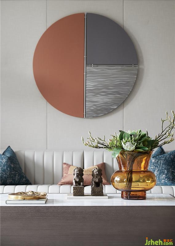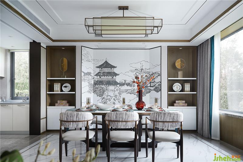 背景墻面的園林畫作大氣而富有內(nèi)涵,將人文氣息呼之欲出,增強(qiáng)了空間的立體感與細(xì)節(jié)感,讓畫不再只是一幅畫,而是整個(gè)空間氛圍中的一部分。