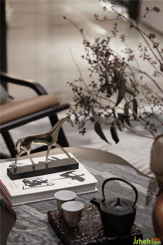 茶臺(tái)上小型松樹盆景橫挑構(gòu)成形態(tài)之美,賦予空間生命力,讓韻味典雅的東方禪意躍然于眼前。