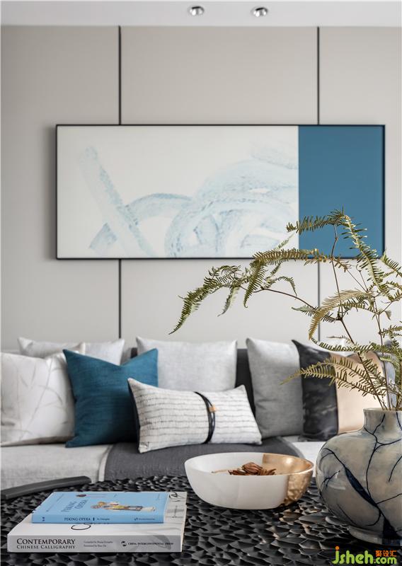 背景墻上的裝飾畫(huà)含蓄而澄凈,而畫(huà)上一抹頗具風(fēng)姿的孔雀藍(lán)也為空間增添了無(wú)限詩(shī)意,既與沙發(fā)上的抱枕在色彩上相互呼應(yīng),又與整體空間相宜得章,豐富了空間的畫(huà)面感,提升了空間的藝術(shù)格調(diào)。