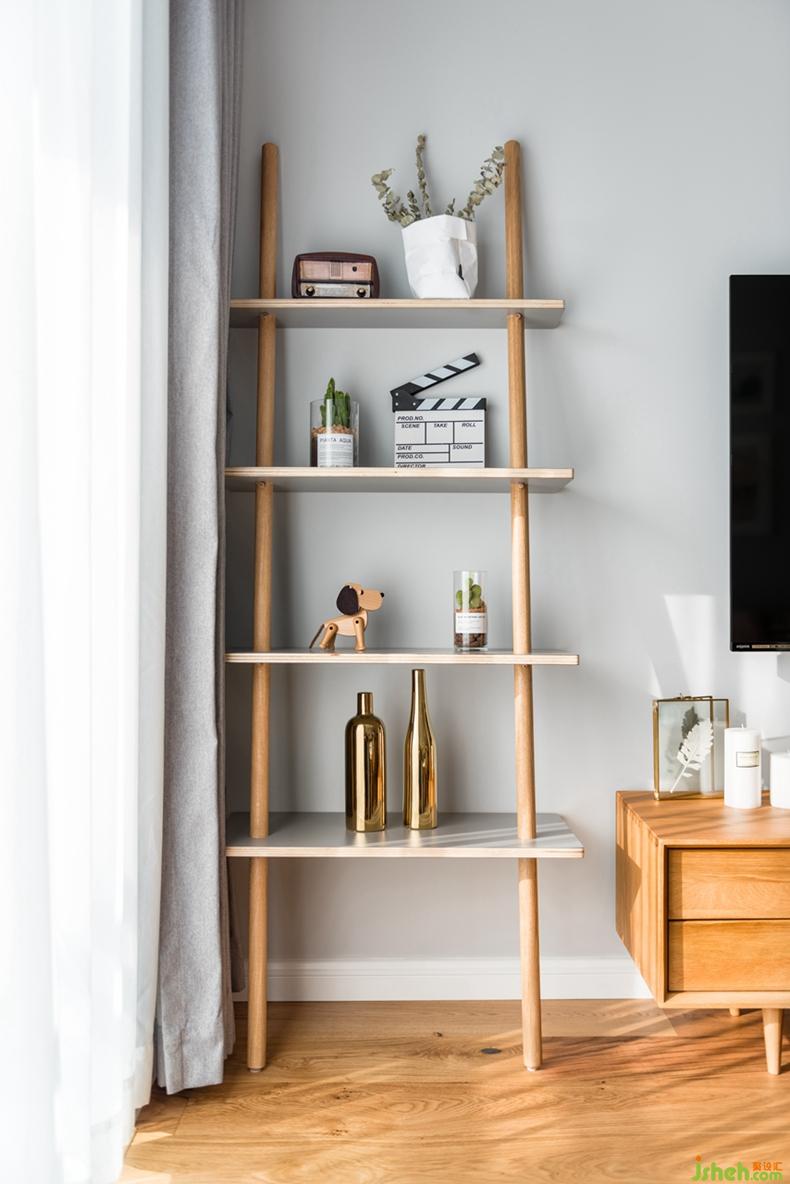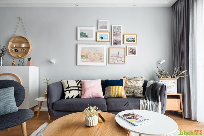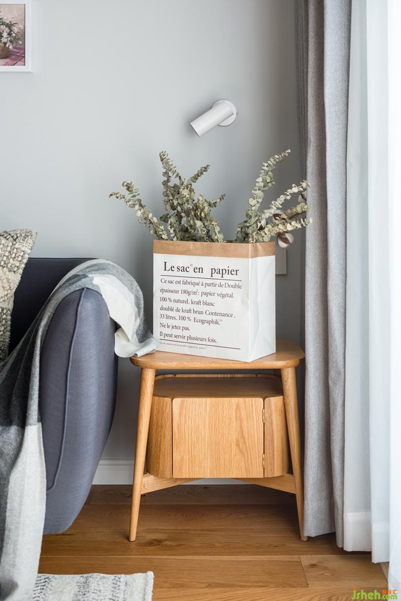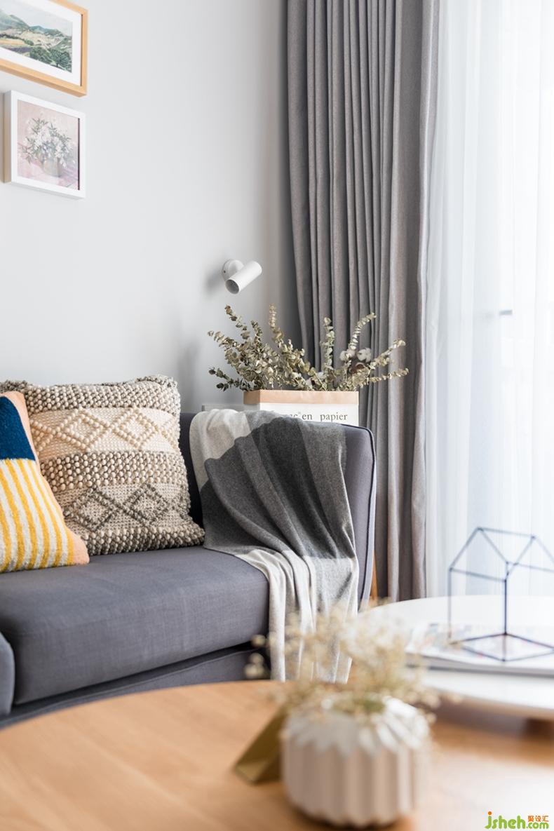 以白色和原木色打底,搭配深深淺淺的灰色穿插在空間里,通過抱枕和掛畫的色彩及幾何圖案點亮空間表情,不多不少,恰到好處。
