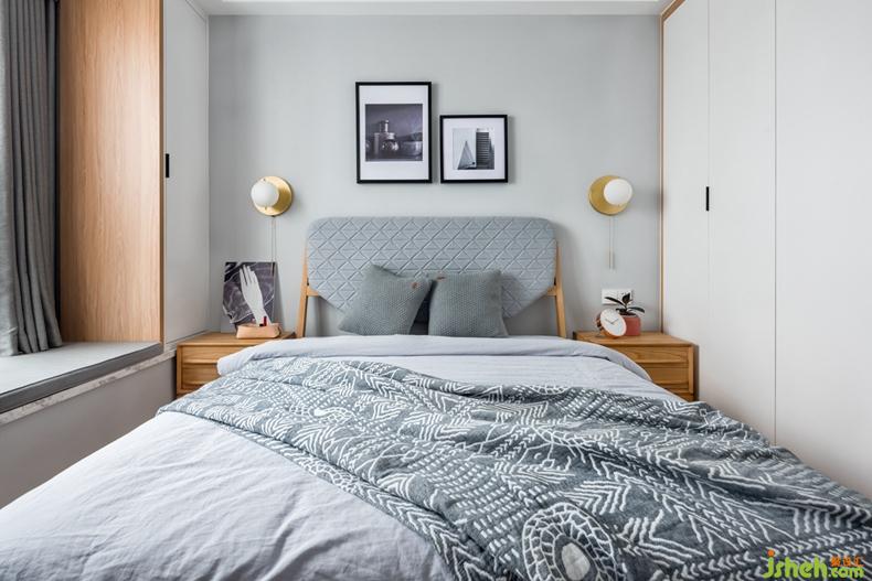 主人房延續(xù)了客廳的灰白及原木色調(diào),通過床品、窗簾、靠枕,搭毯等織物提升室內(nèi)的情調(diào),使臥室更趨于溫暖,同時(shí)也能體現(xiàn)一個(gè)人的生活品味。