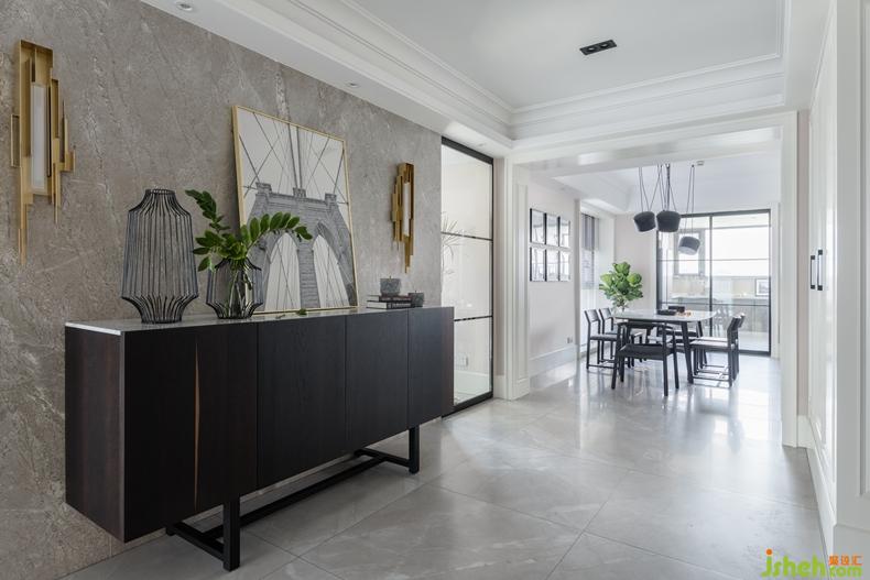 一進(jìn)門,首先引入眼簾的,便是方正的門廳,極具質(zhì)感的大理石墻面,大氣穩(wěn)重的邊柜,金屬邊框的建筑攝影畫,隨眼可見的質(zhì)感在低調(diào)的展示著。室內(nèi)設(shè)計(jì)師