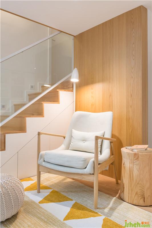 為了培養(yǎng)出閱讀的氣氛,在這個(gè)形形色色的世界里保留住心中的一片靜地,所以這個(gè)客廳里設(shè)置了一小面墻的書(shū)架。取代電視機(jī)的是可以放在定制版升降機(jī)上的投影儀。在毛絨絨的地毯上,可能是你靠著我,我靠著她相依偎著。也可能是一個(gè)東倒西歪的趴在沙發(fā)上,另一個(gè)蜷在樓梯旁,或是躲在閣樓上看電影。