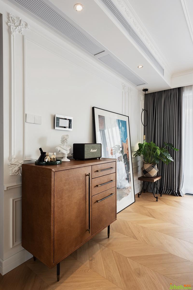 加入復(fù)古元素讓整個(gè)家渾然一體。色彩靈感來(lái)源于斯洛伐克@Evelyn Bencicova的攝影作品,她的作品保持著一貫的成熟構(gòu)圖與飽滿的敘事性相結(jié)合,運(yùn)用冷淡的色調(diào)滲出濃厚的氛圍,色調(diào)在某種程度上,令觀看的人沉入其中無(wú)法自拔。 所以設(shè)計(jì)師將作品中冰冷的色調(diào)進(jìn)行延伸,大面積的運(yùn)用到空間設(shè)計(jì)中來(lái)。結(jié)合居住者的濃厚藝術(shù)氣質(zhì)在空間中大膽加入黑色,并且利用黑胡桃木進(jìn)行調(diào)和,提高空間色彩飽和度。最后加入油畫及金屬配飾營(yíng)造出賦予獨(dú)特意義的復(fù)古氣息。 深圳裝修公司