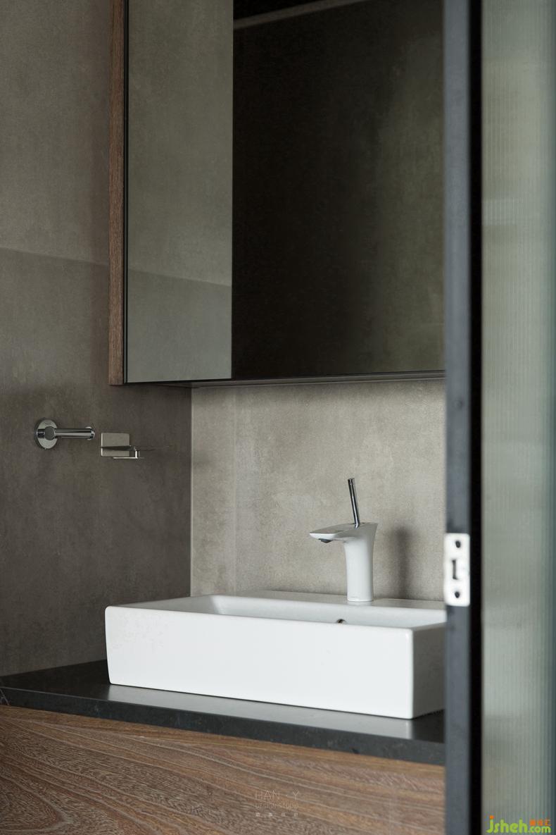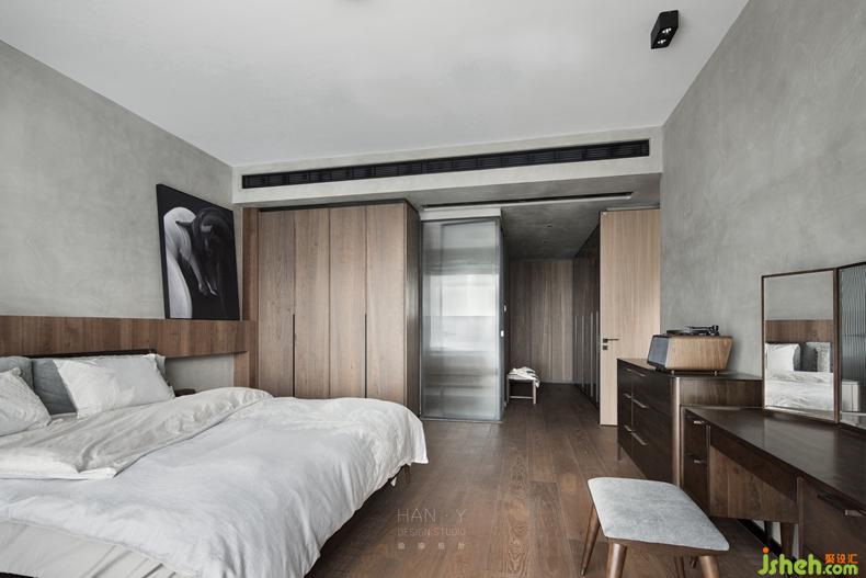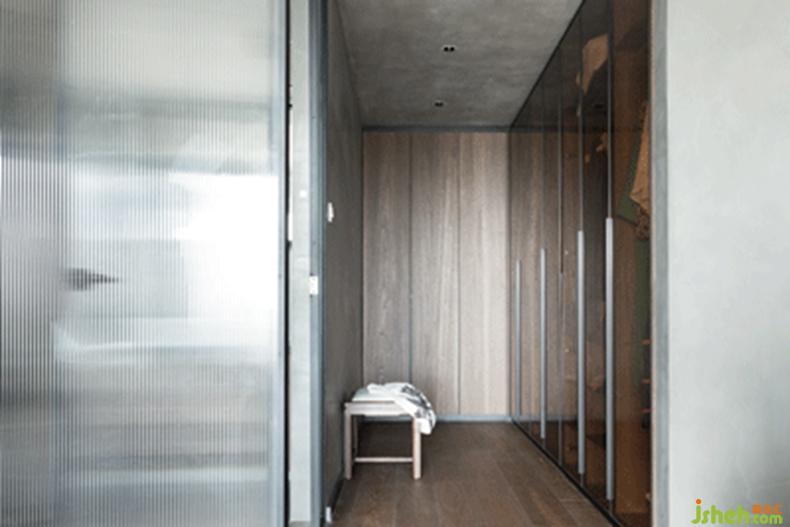 衣帽間使用半開放式設(shè)計,在窄的一側(cè)才用全玻璃門,加深空間的開間。木質(zhì)與玻璃的碰撞,虛實結(jié)合的收納令空間擴容,“實”于收納,“虛”于展示。女主人的典雅裙裝,透過玻璃,尊顯高貴。衛(wèi)浴間在保證功能使用的情況下從視覺上被弱化,玻璃隔斷使衛(wèi)浴間也能享有陽光的攝入。