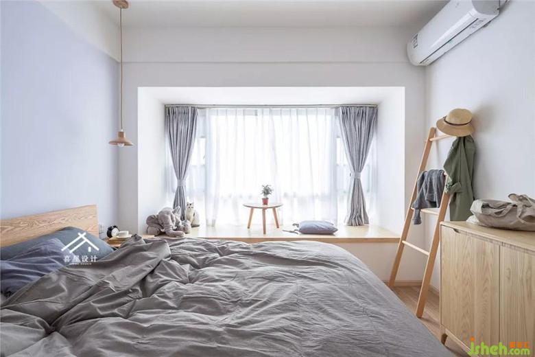 飄窗同樣做了木板的飄窗臺,在床尾放一個斗柜也是很方便的。一個梯子的掛衣架,可以放換下的衣物。這樣的設(shè)計,可以讓生活中必然的隨意性產(chǎn)生溫暖的化學(xué)反應(yīng)。