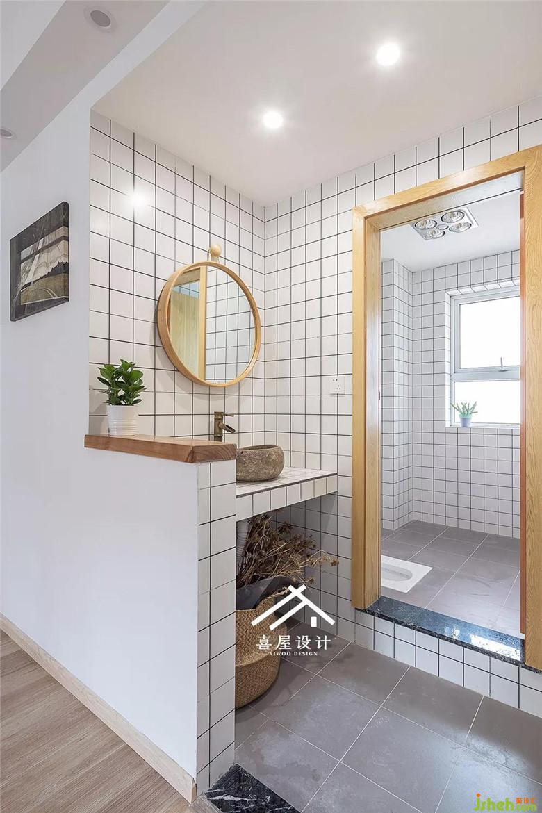 干區(qū)用的小白磚,用現(xiàn)澆板做的臺面,上面放一個石頭的盆子。原來干區(qū)是一堵到頂?shù)膲?,敲掉一半以后,剛好可以放點小東西。